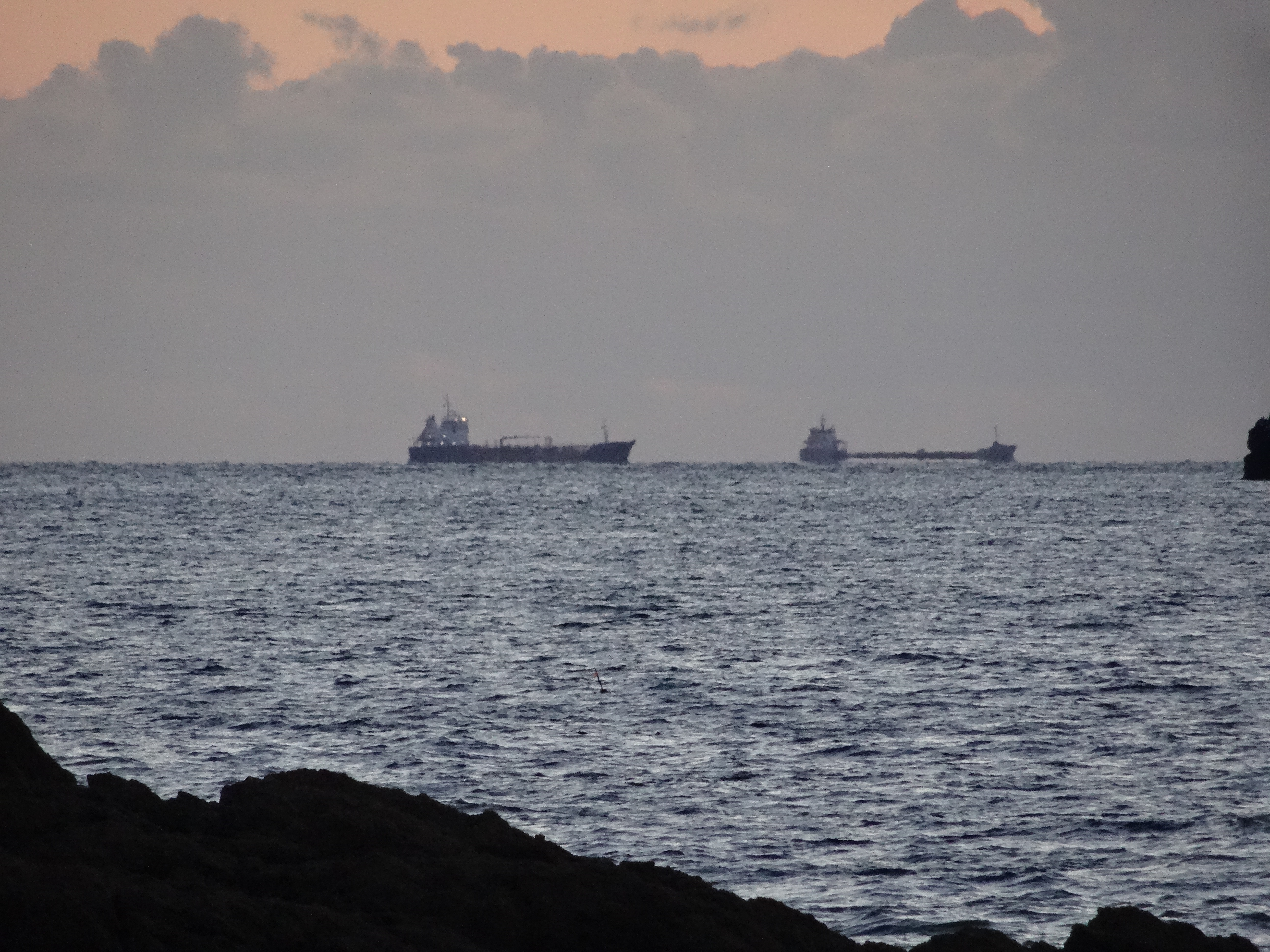 Des portes-conteneur croisent au abord de la plage des Chevrets à Saint-Coulomb.